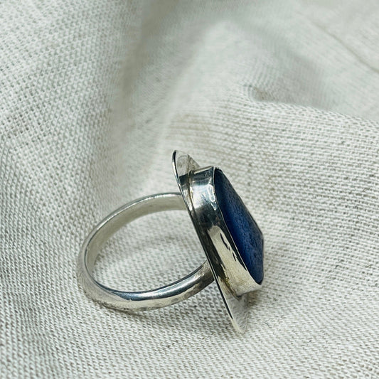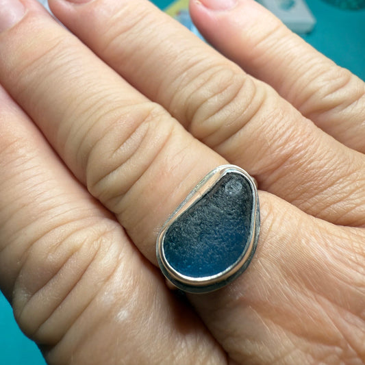 Ocean Blue: Organic Shaped Sea Glass Ring in Sterling Silver – Size 8