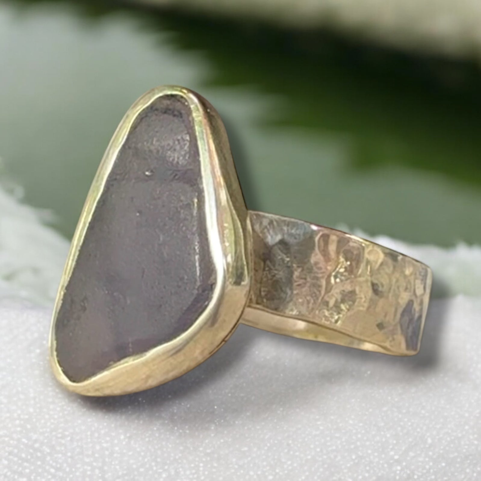 The 5mm hammered band provides a subtle yet elegant finish, perfectly complementing the sea glass’s natural allure. With its handcrafted design, this ring is as unique as the person who wears it.