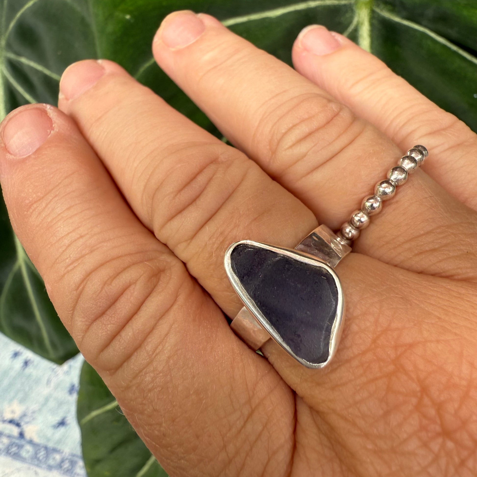 Immerse yourself in the beauty of this one-of-a-kind piece of jewellery. Featuring a deep lilac triangular sea glass gem, this handmade sterling silver ring is a true treasure. The unique texture of the sea glass adds character and charm, reminiscent of gentle ocean tides under twilight skies.